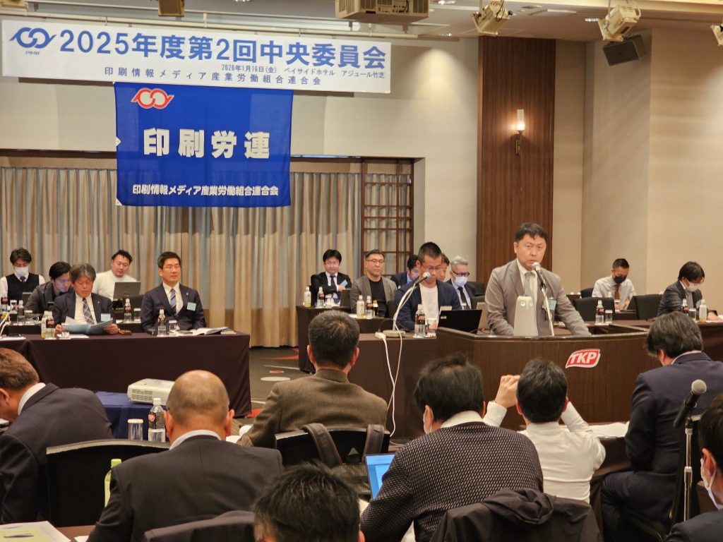 2026年1月16日(金)に東京・アジュール竹芝にて、第2回中央委員会を開催しました。印刷労連としての2026春季生活闘争方針を確認し、今春闘の本格スタートをきりました。スローガン「日本経済の好循環と企業の成長を確実なものにしよう!」のもと、全構成組織が一丸となって取り組むべく、横の連携をしっかりと取り、団結して闘い抜いていくことを共有しました。